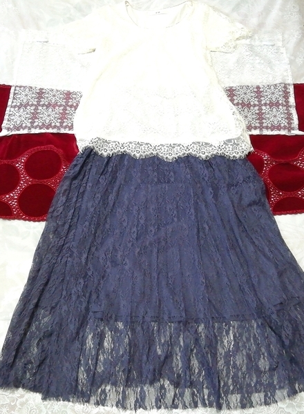 > 白レース半袖チュニック ネグリジェ 紺レースロングスカート 2P White lace short sleeve tunic negligee navy blue lace long skirt