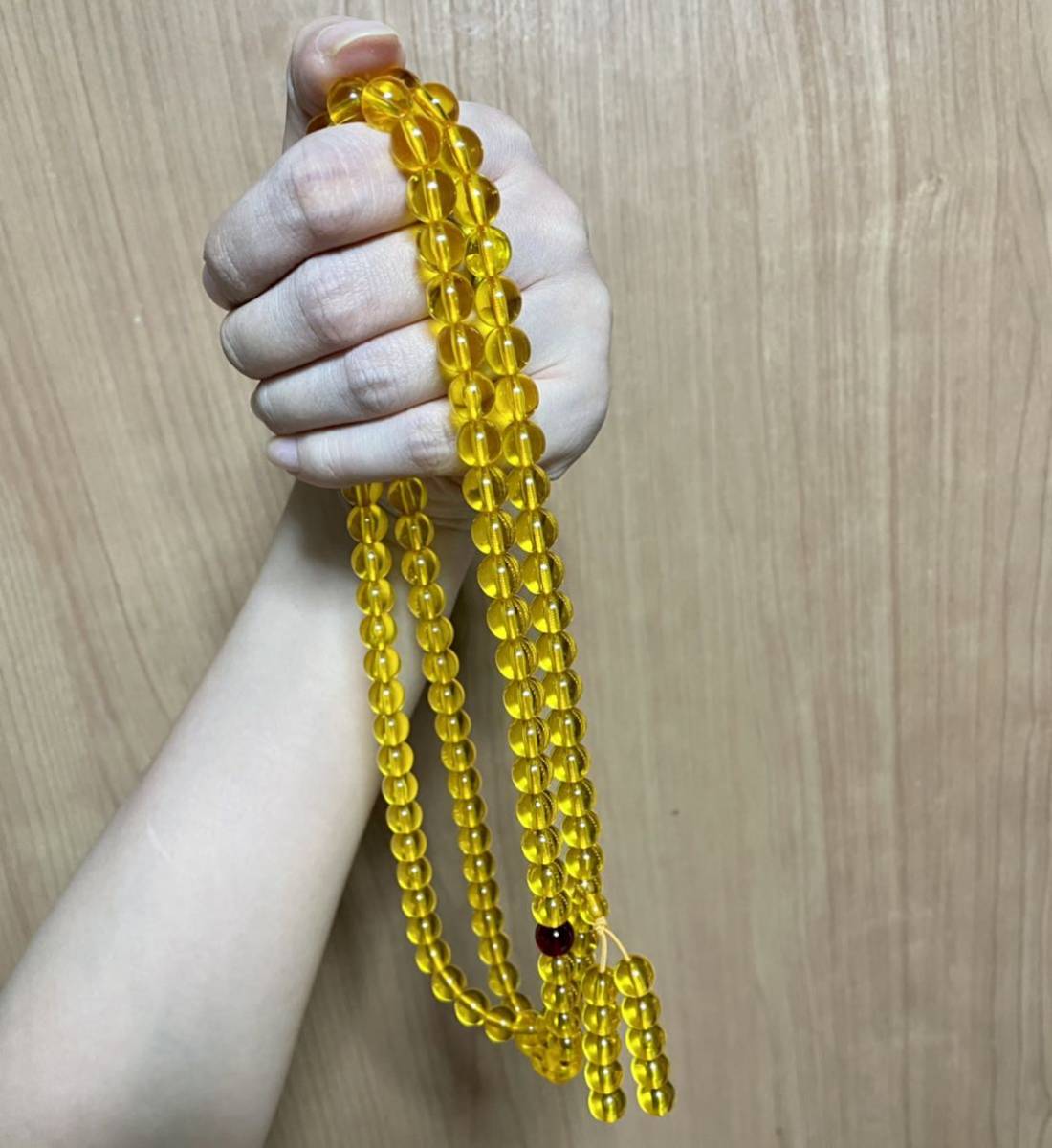 - 数珠 合成琥珀ブレスレット 8mm アンバー 蜜蝋 イエロー 108珠 アクセサリー レディース 男女兼用 御守り 魔除 幸運 ラッキー 金運UP