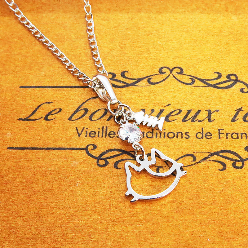 - 三毛猫の猫フェイスモチーフのフレームと魚のチャームの可愛いネックレス キュービックジルコニア SV925変更可