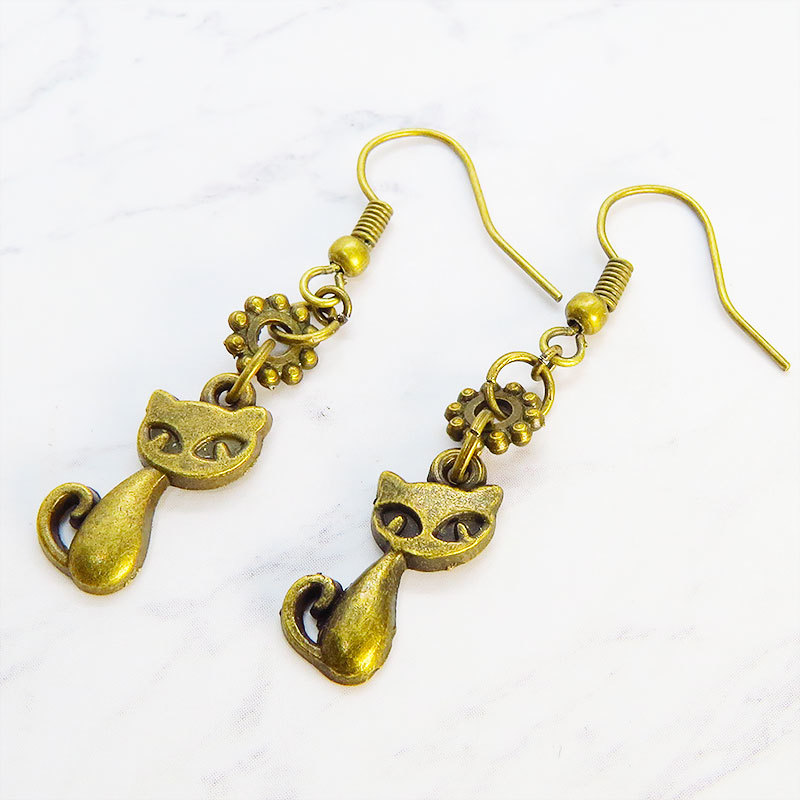 - アンティークゴールド 猫と花モチーフを組合せたシンプルでコンパクトな大人可愛いピアス