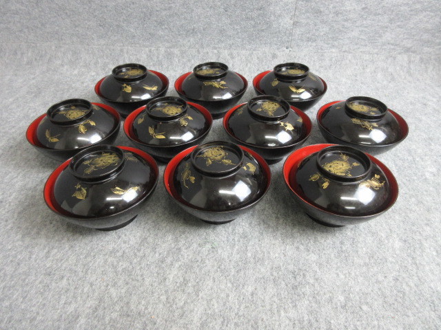 - 【政】30283 輪島黒塗内朱沈金吸物椀 10個 菓子椀 梅椀 骨董 古物