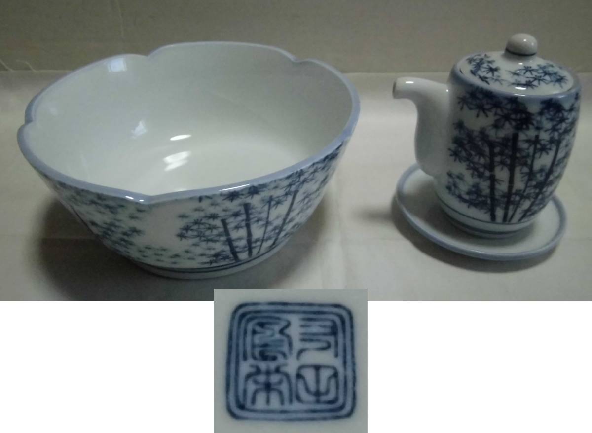> 漬物揃 在銘 中鉢 油差し 受け皿付き 竹柄 染付 お新香 調味料入れ 食器 陶器 工芸品 レトロ