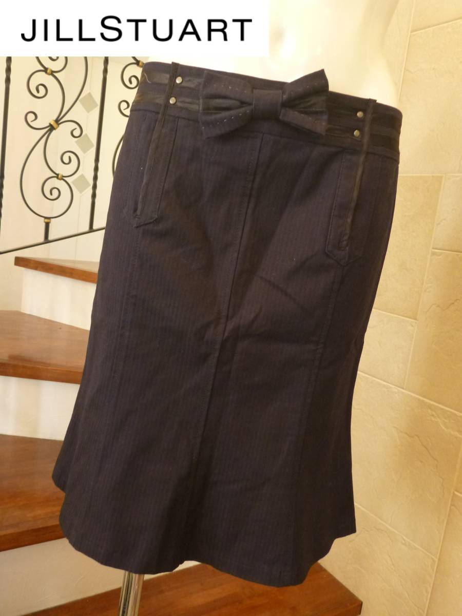 > 1.8万 超美品 ジルスチュアート JILLSTUART ★紺×黒 裾フレア ウエストリボン スカート 2 M相当