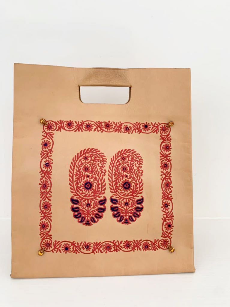 - 【USED】DOGGYBAG ヌメ革 本革 刺繍 ハンドバッグ ペイズリー ショッパー型 ビジュー ドギーバッグ