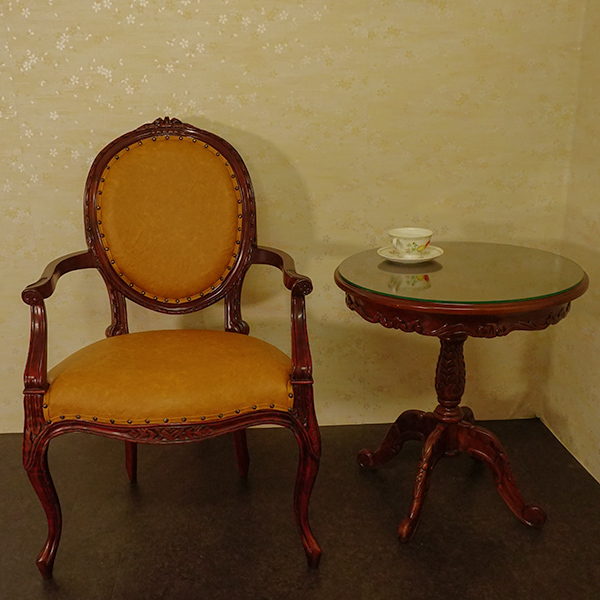- アンティーク調マホガニー 机椅子 アームチェア 合皮 茶 サイドテーブル コーヒーテーブル 2点セット 激安 オープン記念