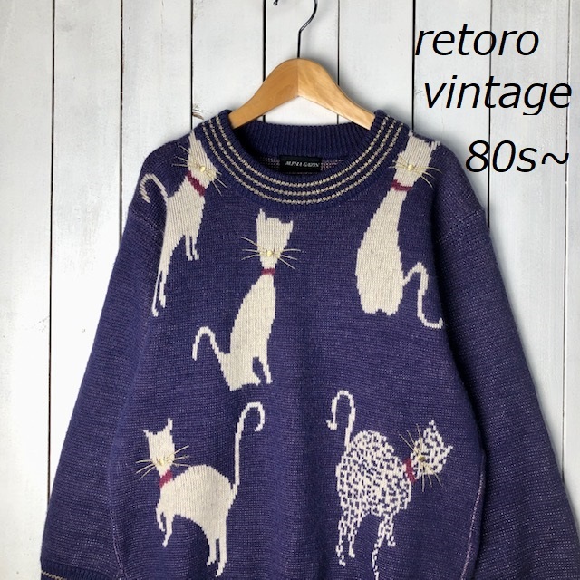 - 国産レトロ古着 80s~90s アンゴラ混 ネコ柄 ニットセーター 紫 オールド ヴィンテージ 春秋冬 アクリル ウール 日本製 アニマル柄 ●151