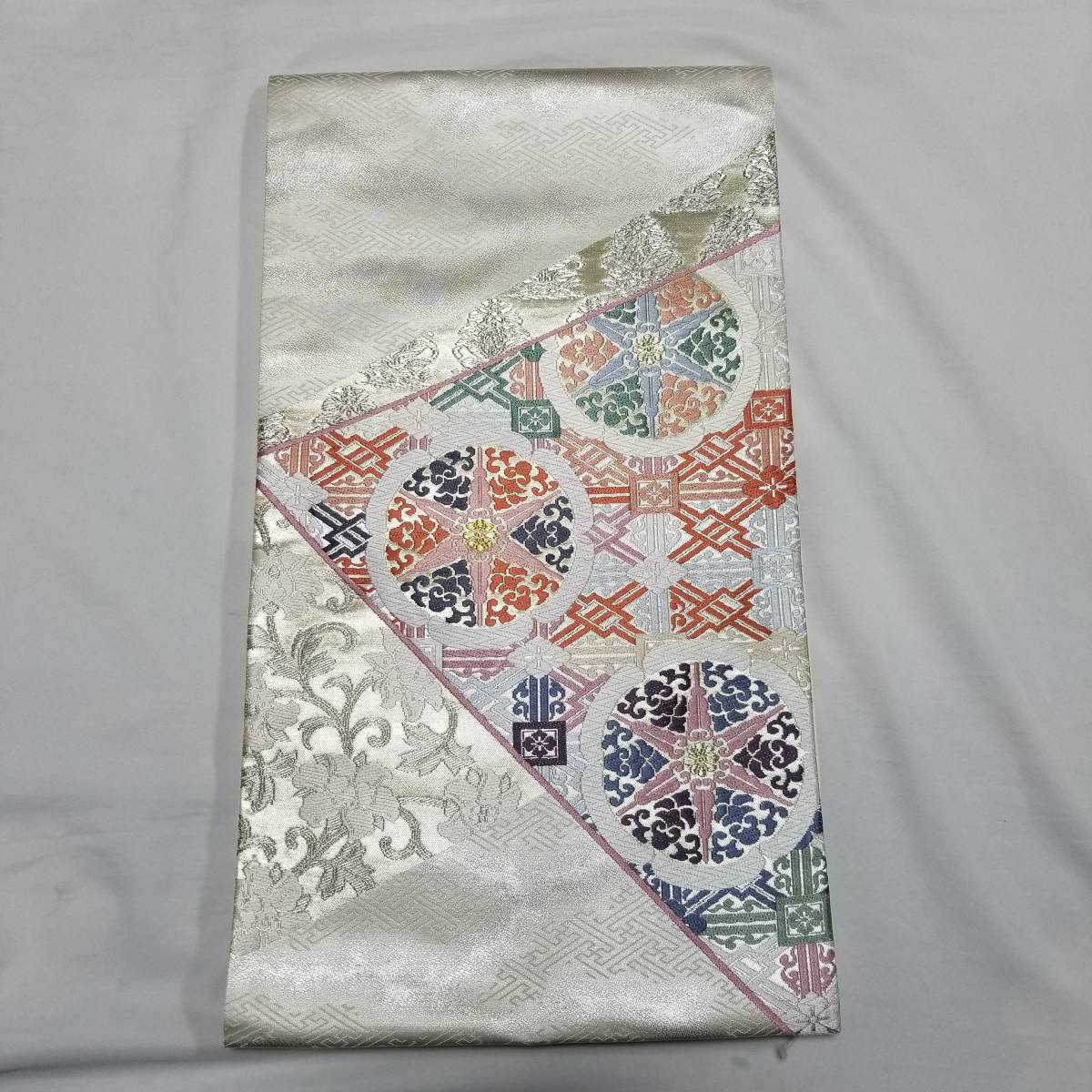 - 【桐輪】袋帯☆送料無料*唐織調.正倉院文様*未使用品{正絹*西陣織*袋帯}*白地に幾何学文と雲文織地*唐織調の正倉院文様*お太鼓柄*№3219