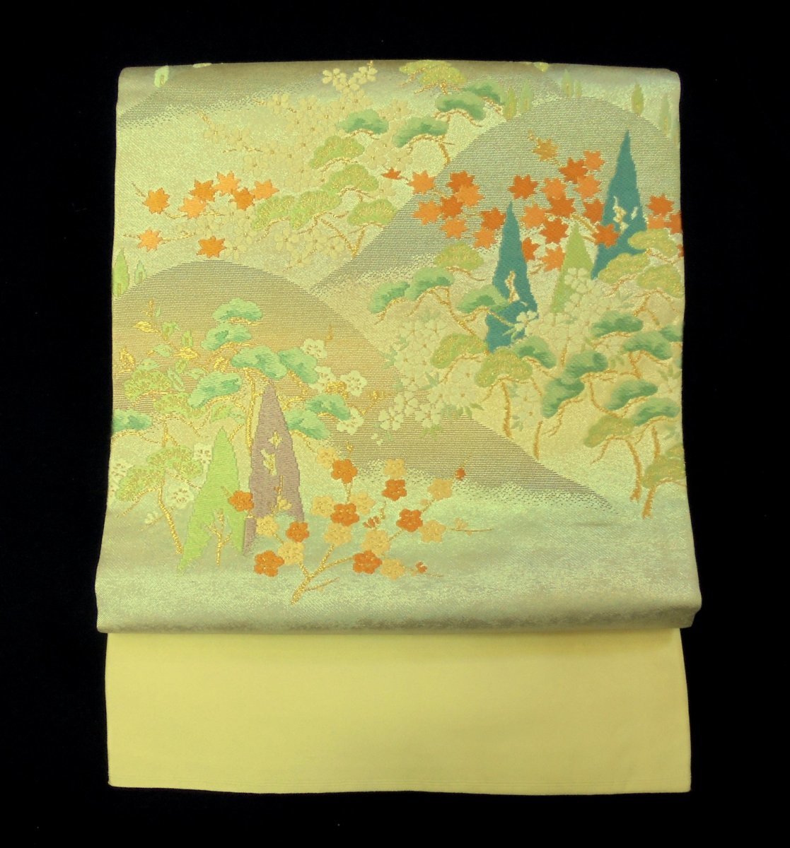 > 5781 【リサイクル】 正絹 名古屋帯 「薄黄色・遠山」-