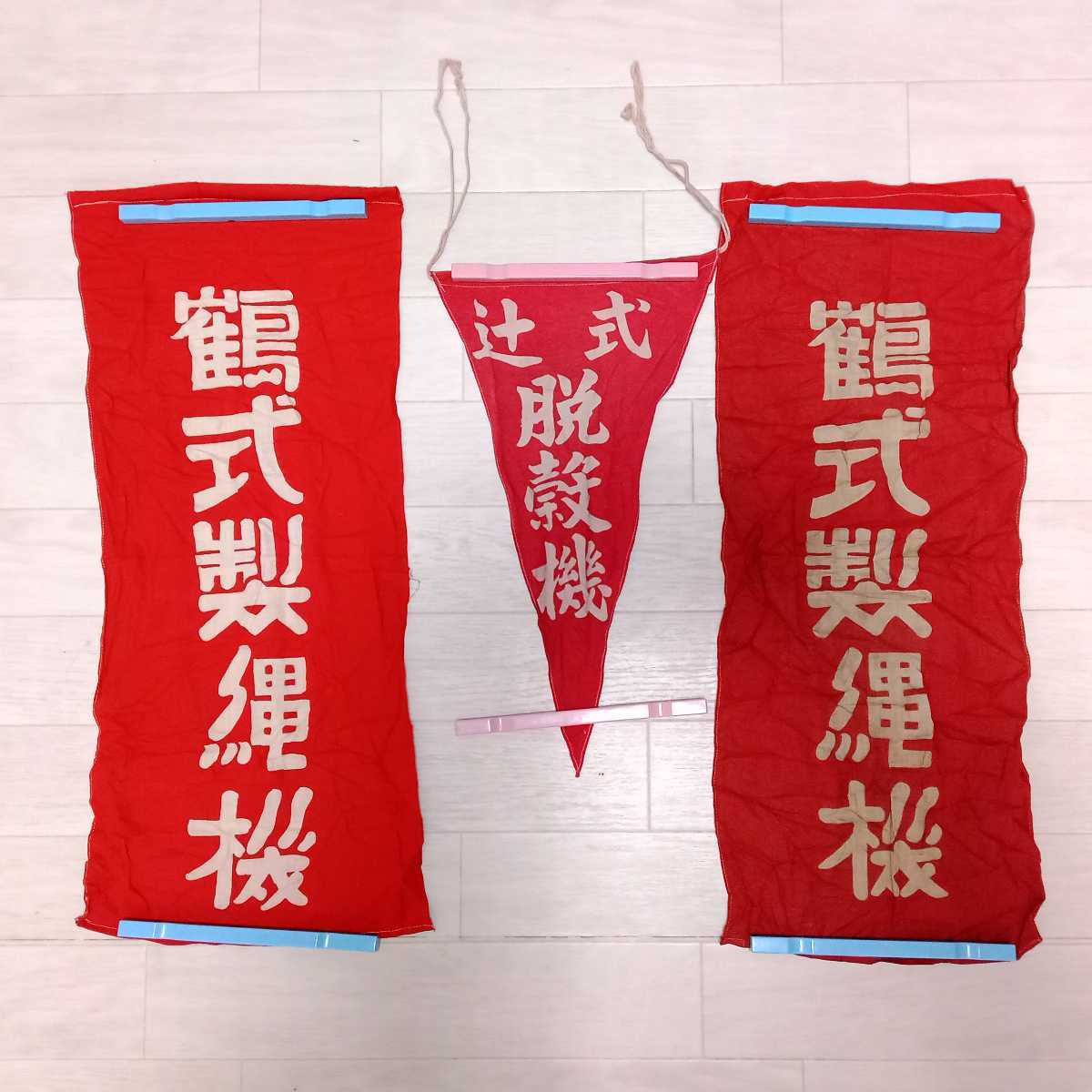 - 【ビンテージ】★3枚セット★鶴式製縄機★辻式脱穀機★旗★フラッグ★古布★ディスプレイ★レトロ★アンティーク★高さ65cm