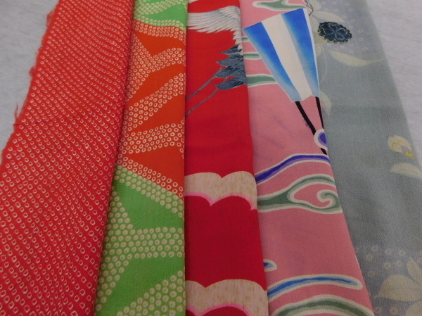 > 〔楽布〕P8025 正絹 古い錦紗縮緬布 5枚組 約31~36cm 大正ロマン k