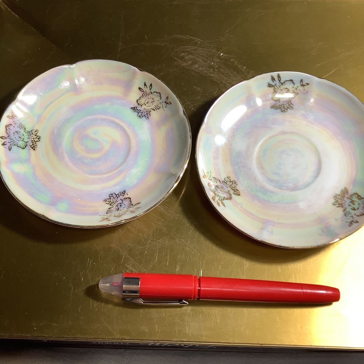 - 丸皿 2枚 500円以上複数10%商品オマケ 皿直径13cm 貝殻風 アイボリーに金色の柄