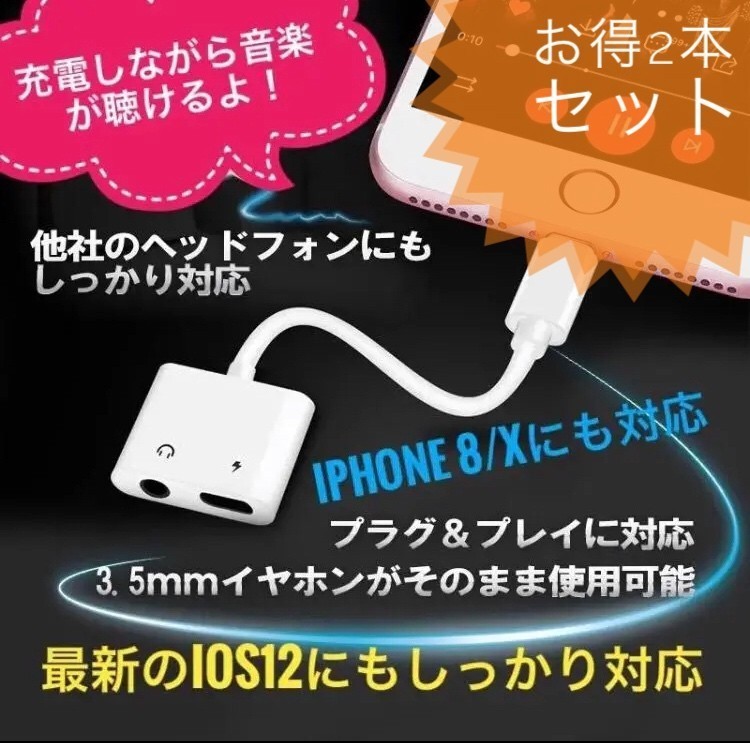 > 【大好評】最新iOS12対応 iPhone 2in1 充電 &イヤホン オーディオ ダブルジャック ケーブル x2本セット
