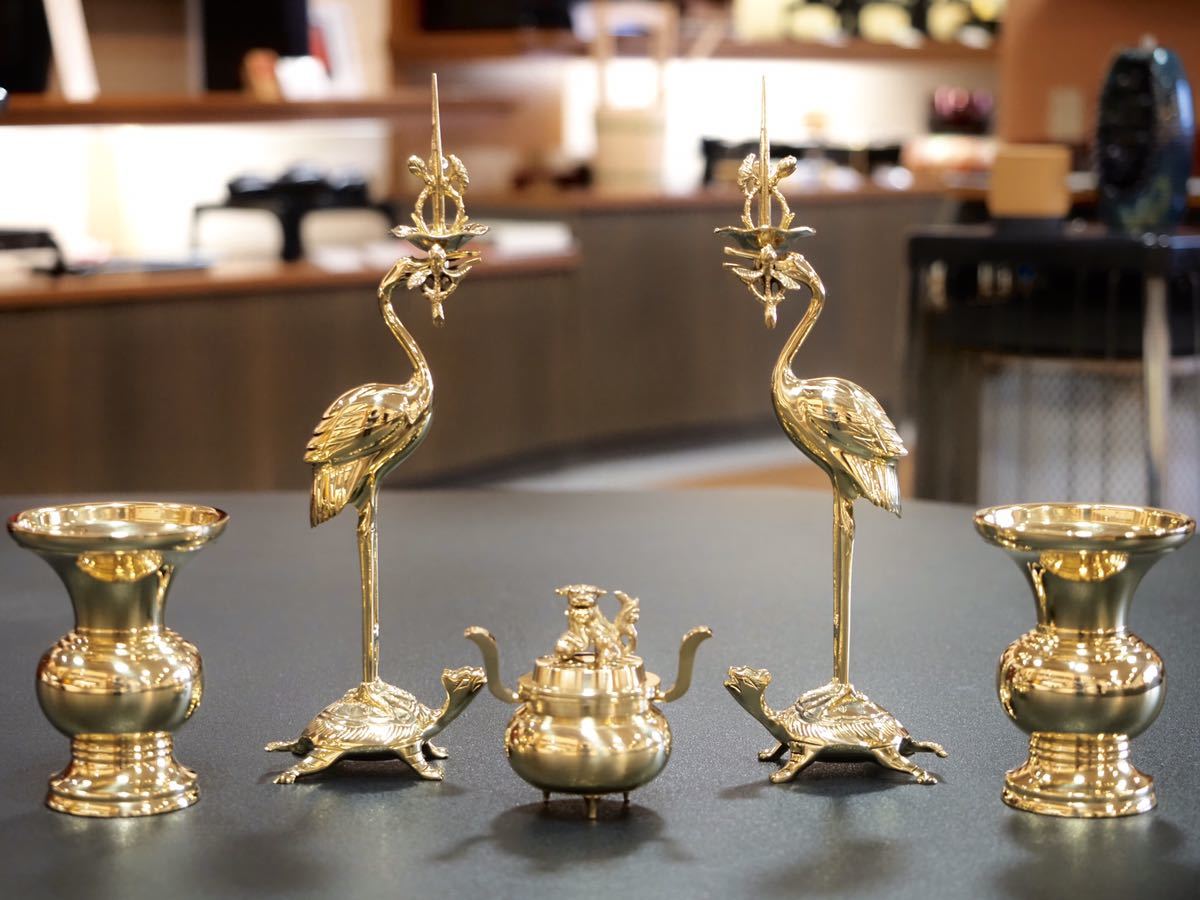 - 新品未使用 丸鶴 五具足 4.0号 上磨 仏壇 真鍮 鶴亀 仏具