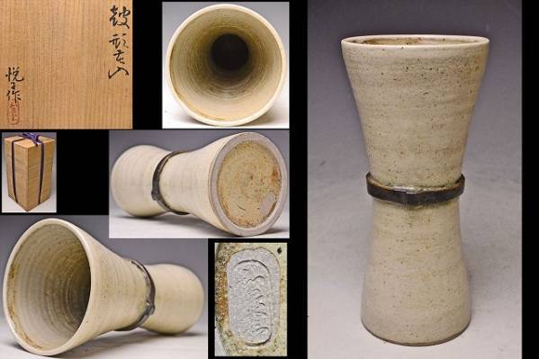 > 和泉窯 ★ 悦子 在銘 ★ 黄瀬戸風鼓形花入 ★ 共箱 ★ 茶道具 ★ 華道具 ★ 作者不明