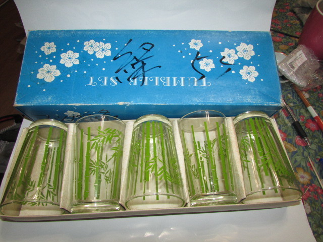 - (旧家・蔵出し)(古いレトロな竹模様ガラスコップ・5客)1客欠けあり・昭和レトロ