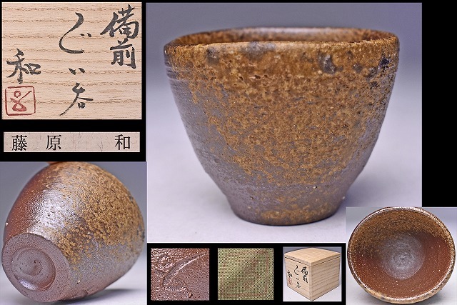 > 藤原和 ★ 備前 ぐい呑 ★ 共箱 共布 栞 ★ 祖父: 人間国宝 藤原啓 / 父: 藤原雄 ★ 楕円の造形が手取りの良い逸品 ★ 酒器 ★