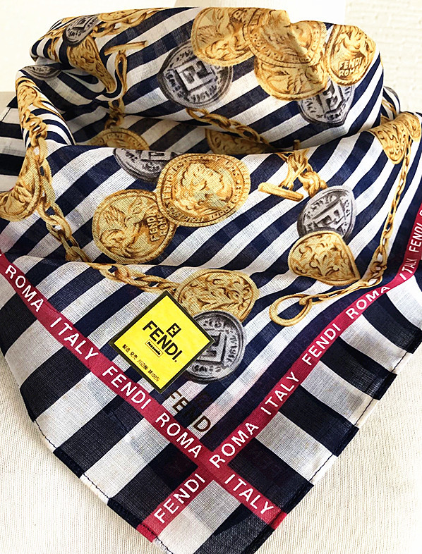 > 新品 フェンディ FENDI ◆レア柄 ダブルF ズッカ柄 ストライプ&ハンカチ ミニスカーフ★膝掛け (0419D41600)