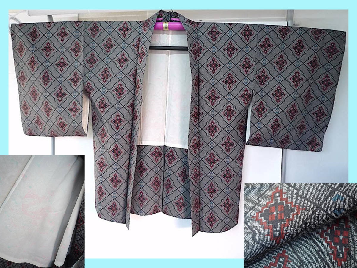 - 逸品 未使用保管品 大島紬 着物 羽織 正絹 伝統 泥染め 龍郷柄 幾何学 赤 青 春秋 羽裏 花柄 古典 グレー系 ハリ 身丈約75㎝ 裄丈約65㎝ A2