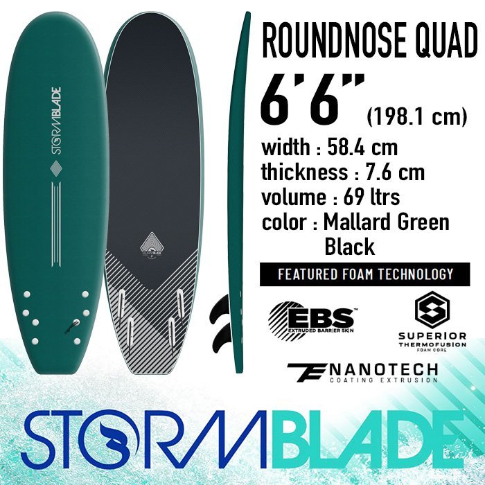 > ■STORM BLADE 6'6(198cm) QUAD MALLARD GREEN■ワンランク上の本格派 ソフトボード 抜群の安定感で初心者もOK/リーシュコード サービス