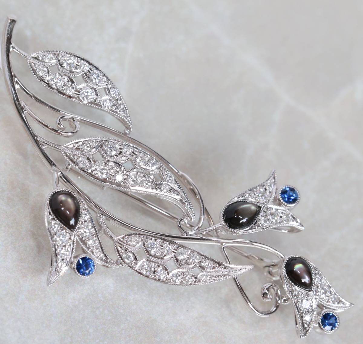 - K18 WG シェル サファイア ダイヤモンド 透かし彫り ブローチ 兼用 ペンダントトップ ミル打ち 750 ミルグレイン