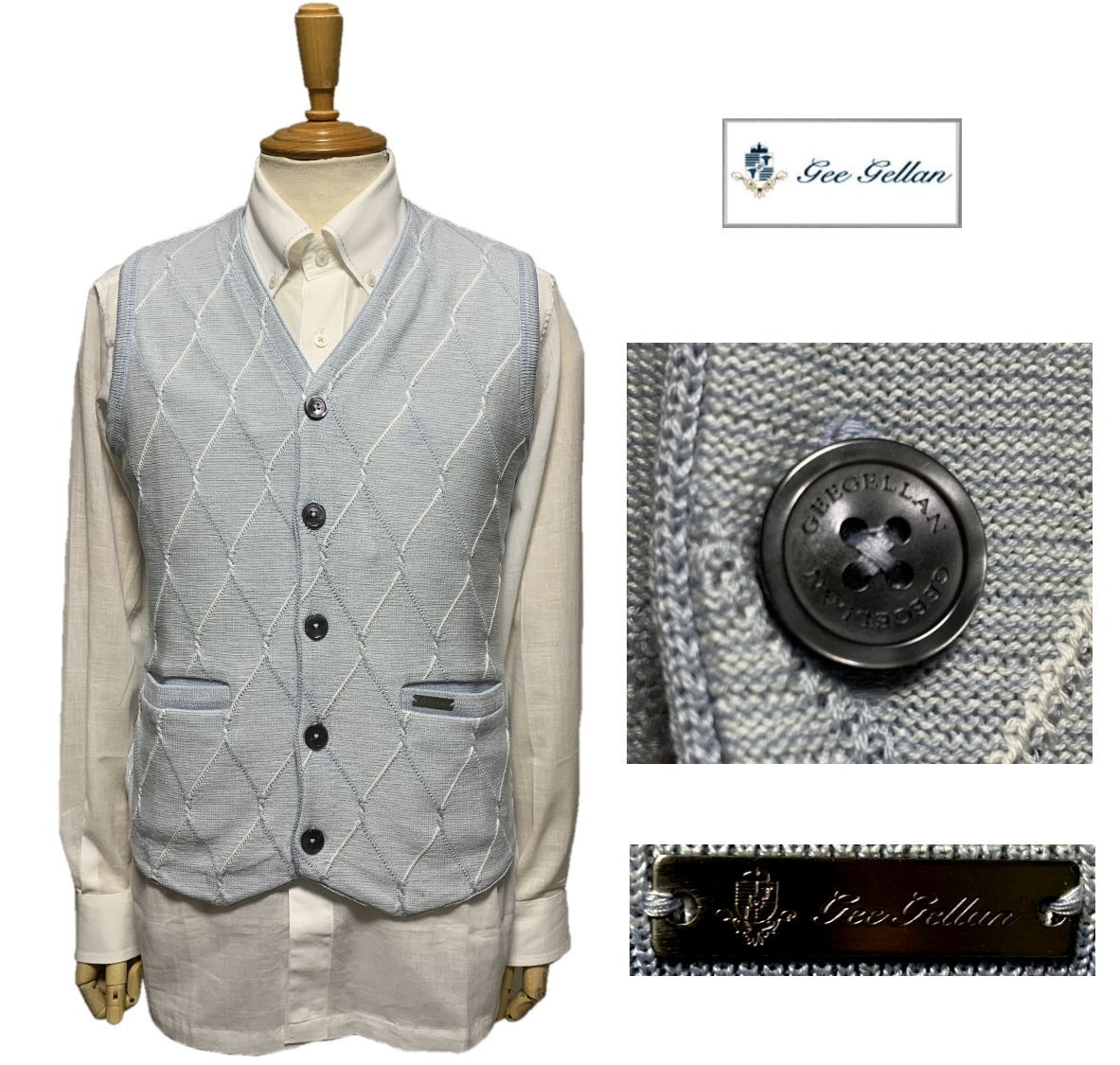 - GEE GELLAN ジーゲラン GEEGELLAN 春夏 前開き ニットベスト ブルー系ライトグレー size46 M