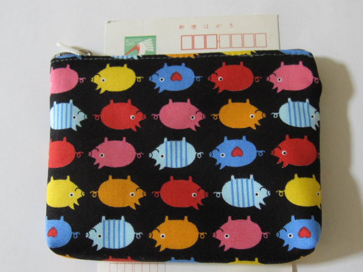 - 手作り 小物 ポーチ 一面 豚 ハート ライン ぶた 模様 動物 ブタ 柄 黒 ハンドメイド オックス 財布 充電器 男女兼用 ファンシー アニマル