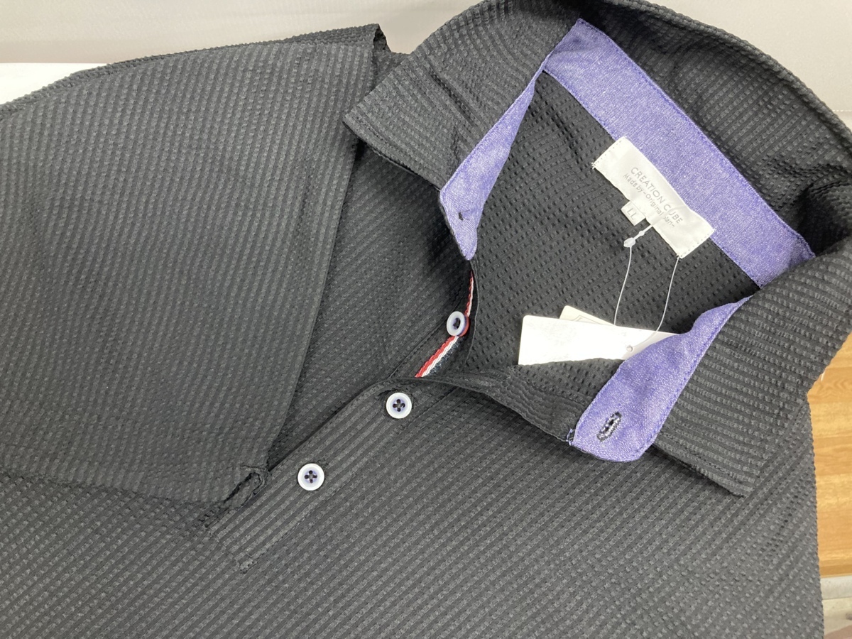 > ★送料割引!ポロシャツ ゴルフシャツ サッカーストライプ ストレッチ ドライ系 接触冷感 L 黒2 CREATION CUBE★未使用格安!