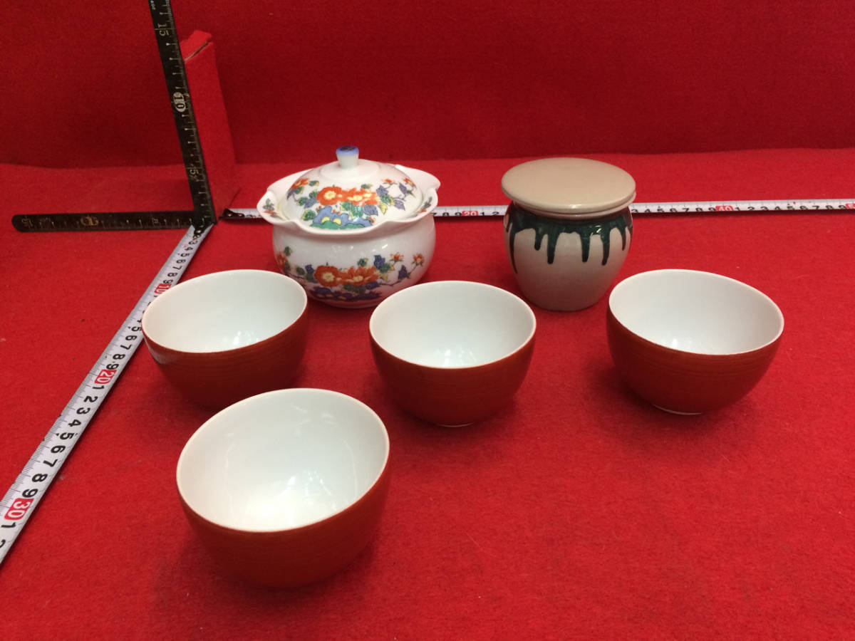 - 昭和レトロ_蓋物 ミニ瓶 湯のみ*4客 あわせて6点_0352