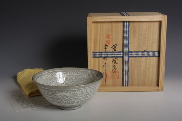 - 7594 韓国陶芸 松南 釜谷陶房 申相浩 三島茶碗(共木箱) 真作 茶碗 茶道具 韓国人間国宝