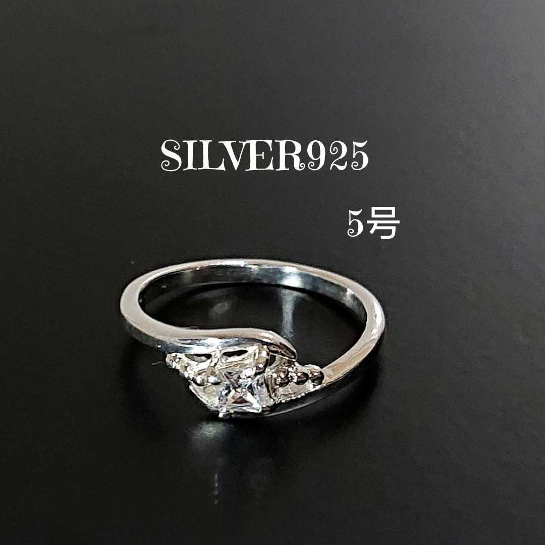 - 5360 SILVER925 ジルコニア ピンキーリング5号 小 シルバー925 スクエア 小粒 ミニ 細 シンプル ひと粒石 四角 透明 ミル打ち 可愛い