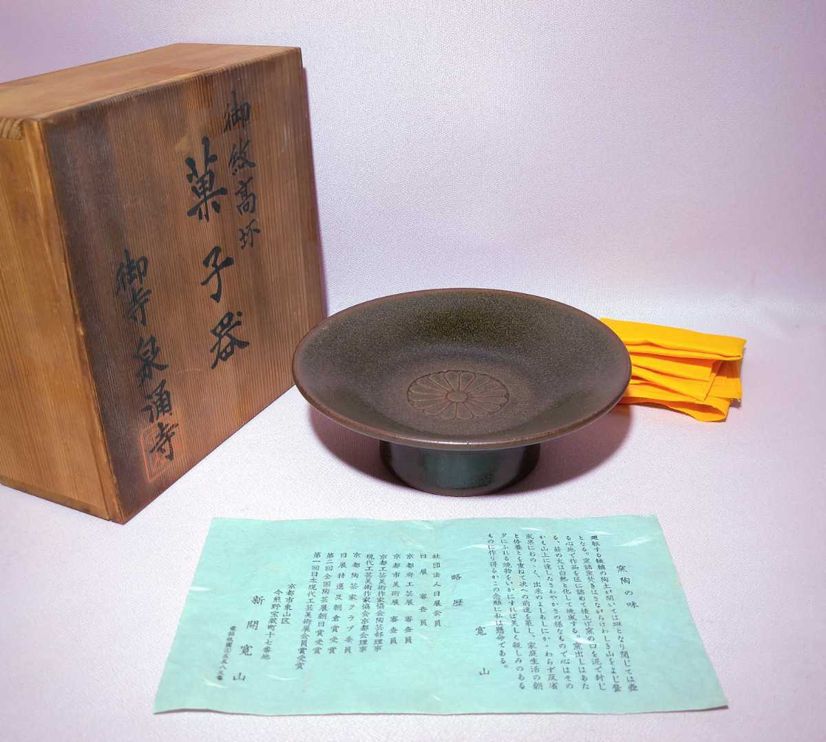 - 新開寛山 「御紋高杯菓子器」 菊の御紋 高脚 15cm 菓子器 共箱 黄布 御守泉誦寺 茶道具 a-11b1358