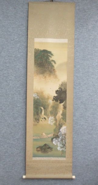 > 【模写】掛軸 春山水 [B31150] 長さ185cm 幅49cm 絹本 風景 床の間 飾り 古玩 古美術