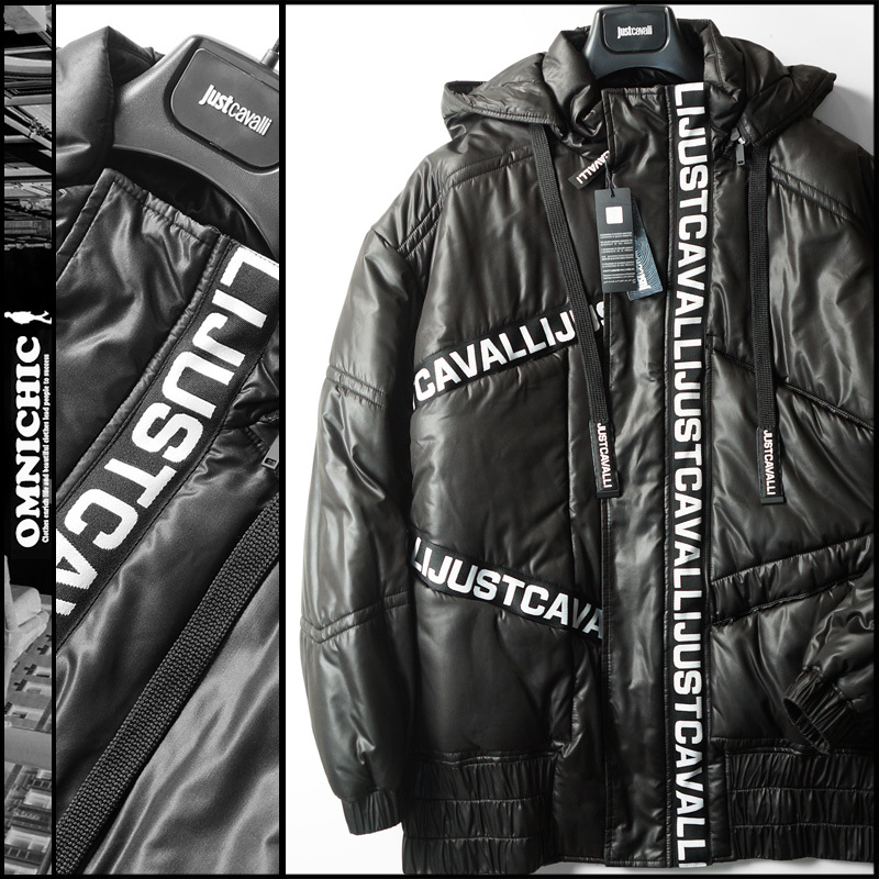 - ■新品12万【JUST CAVALLI】ジャストカヴァリ美しいシルエットが都会派な逸品!全面ロゴが目を引くフーデッド中綿エコダウンミドルコート48