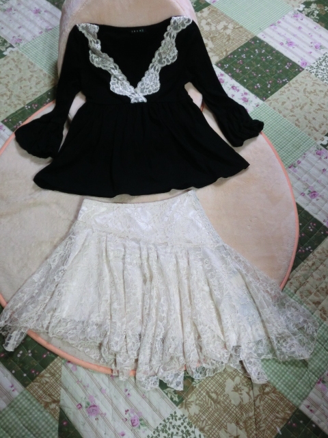 - ■美品&新品:黒色カットソー +ベージュ色レーススカート Tm968