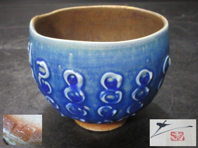 - 今千春 造 BLUE 金彩 茶碗 共箱 検)信楽 辻清明