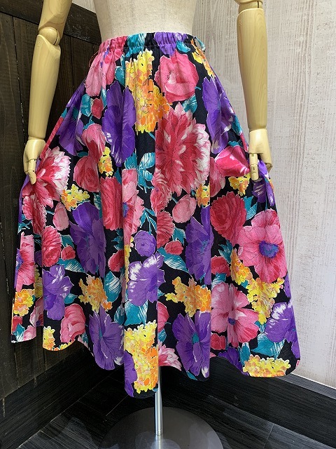 - USA製 80s BINDER SPORTS WEAR 花柄 大判 プリント ウエストゴム ギャザー フレア スカート アメリカンビンテージ レディース古着