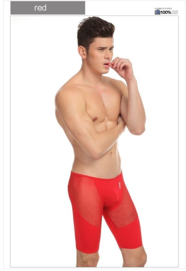 > 送料無料 匿名発送!メンズロングボクサーパンツメッシュ ロングボクサーパンツ 5分丈 吸汗速乾 TOP もっこり 過激 C0095 レッド M
