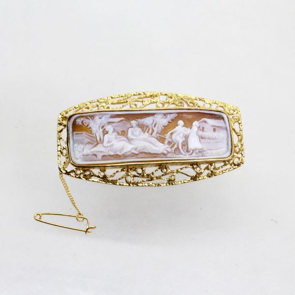 18金枠のシェルカメオブローチです。 落下防止のチェーンがついています。
