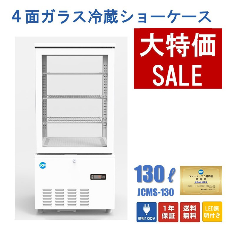 - 新品未使用品 4面ガラス冷蔵ショーケース(片面扉)【JCMS-130】一年保証【送料無料】