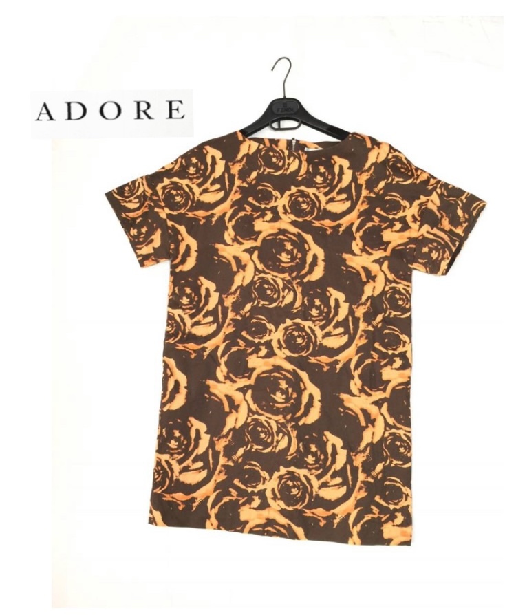 > ADORE アドーア★洗練されたアートな花柄と配色!半袖 チュニック ワンピース サイズ38 オレンジ×ブラウン 茶色 薔薇柄 バラ レディース M