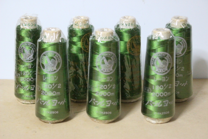 - ▲つ-439 ミシン糸 7巻 中古 120d/2 色:1411 緑系 まとめ売り 箱なし 1巻:高さ12cm