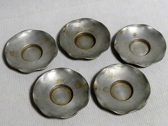 - 煎茶道具 荷葉形茶托5客 底款印 超暉 古錫 茶道具