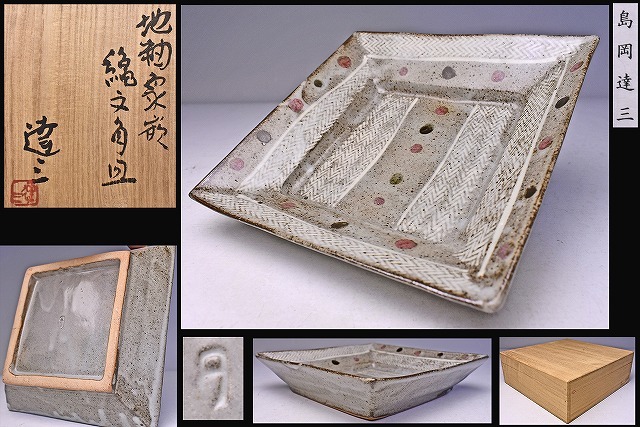 - 島岡達三 ★ 地釉 象嵌 縄文 角皿 ★ 共箱 栞 ★ 人間国宝 ★ 上作 ★ 師:浜田庄司 ★ 色使いがポップな希少作 ★ 検 ゲルトクナッパー