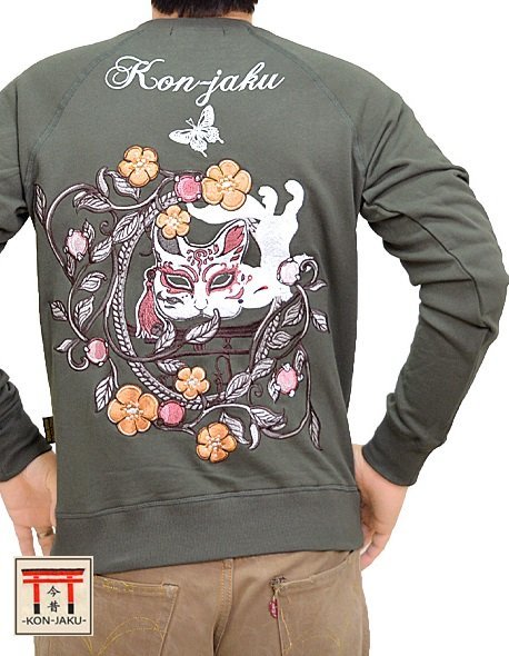 - 鏡の中の狐面トレーナー◆今昔 カーキLサイズ KJ-29110 和柄 和風 きつね キツネ 刺繍 スウェット こんじゃく
