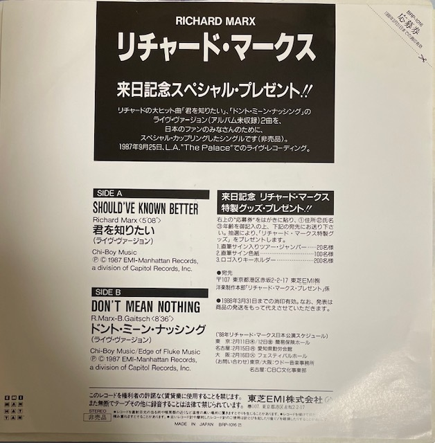 > 非売品 RICHARD MARX リチャードマークス LIVE音源 EP 「君を知りたい」「Don't mean nothing」 1988年