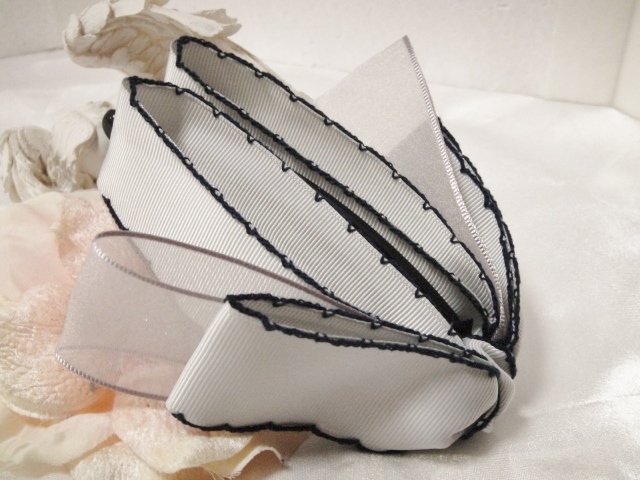 - ♪ 新品 バナナクリップ『高品質/エレガント/ヴィクトリア調/グログラン&レース/ステッチネイビー縁/トリプルリボン/シルバー/アッシュ』♪