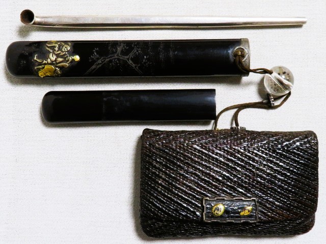 - 時代提物 煙草入 煙管筒 純銀刻印 銀煙管 彫金細工 前金具