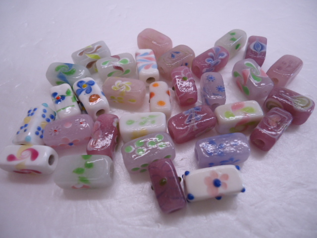 > 【KCM】ビーズ-66★新品★とんぼ玉☆フラワーペインテッド ビーズ 四角柱 31個 淡色系 ガラス/アクセサリーパーツ/ハンドメイド素材