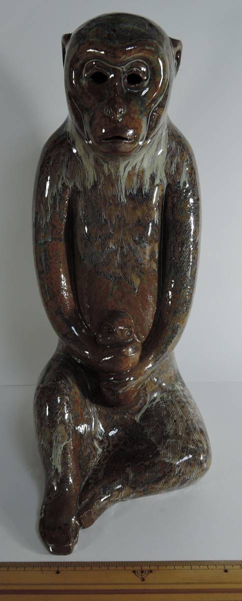 - ☆000■猿親子 置物 陶器製■銘有/静山?
