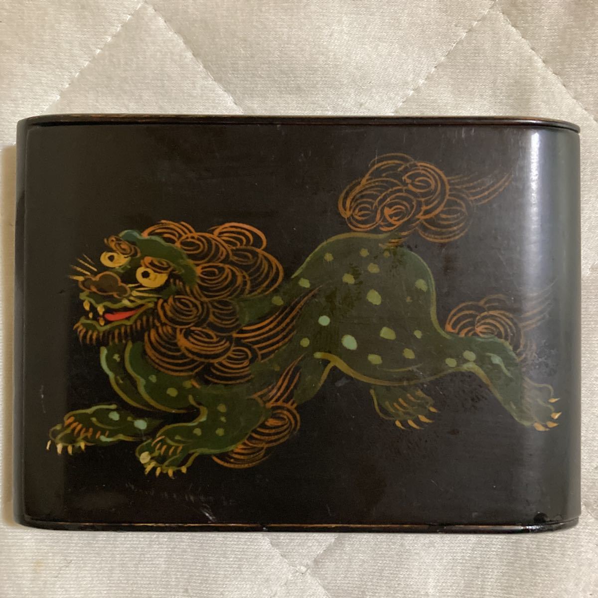 - 明治.大正時代.レトロな獅子の漆絵が書かれた珍しい煙草入れ.材質は木製に黒漆.重さ.約32g.横幅.約10.7cm.縦.約7.7cm厚さ 約1.5cmです。